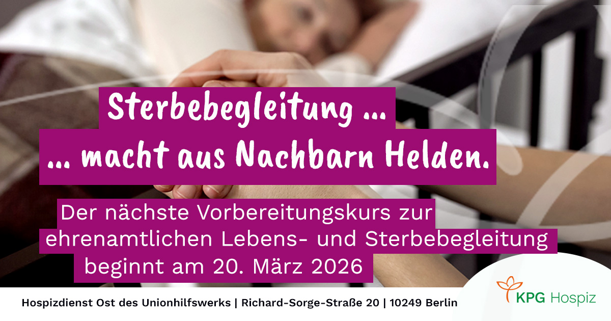 Der nächste Vorbereitungskurs zur ehrenamtlichen Lebens- und Sterbebegleitung beginnt am 20. März 2026 im Hospizdienst Ost in Friedrichshain.